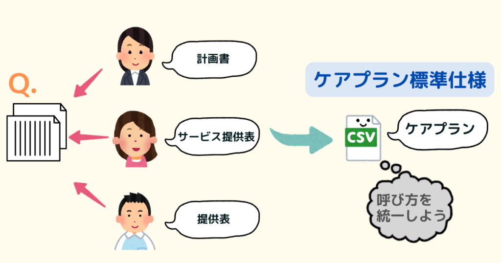 例えば、「介護サービス計画書」、「ケアプラン」、「提供表」などは、いずれも呼び方は異なりますが、同じ物を指しているケースがほとんどではないでしょうか。