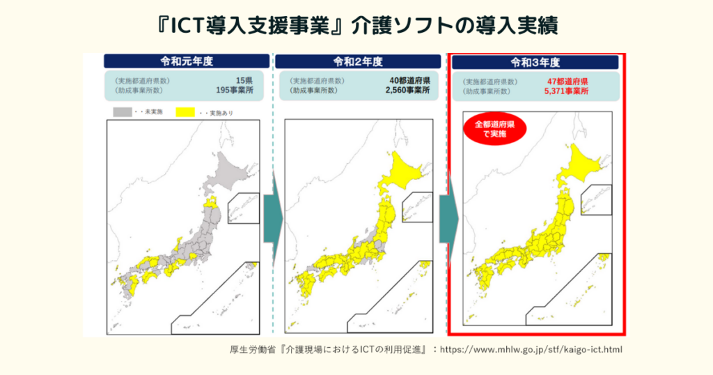 実際に、「ICT導入支援事業」と銘打ち、令和元年度から全国の自治体で介護事業所へのソフト導入が推進されています。(※要件は自治体ごとに異なります。)