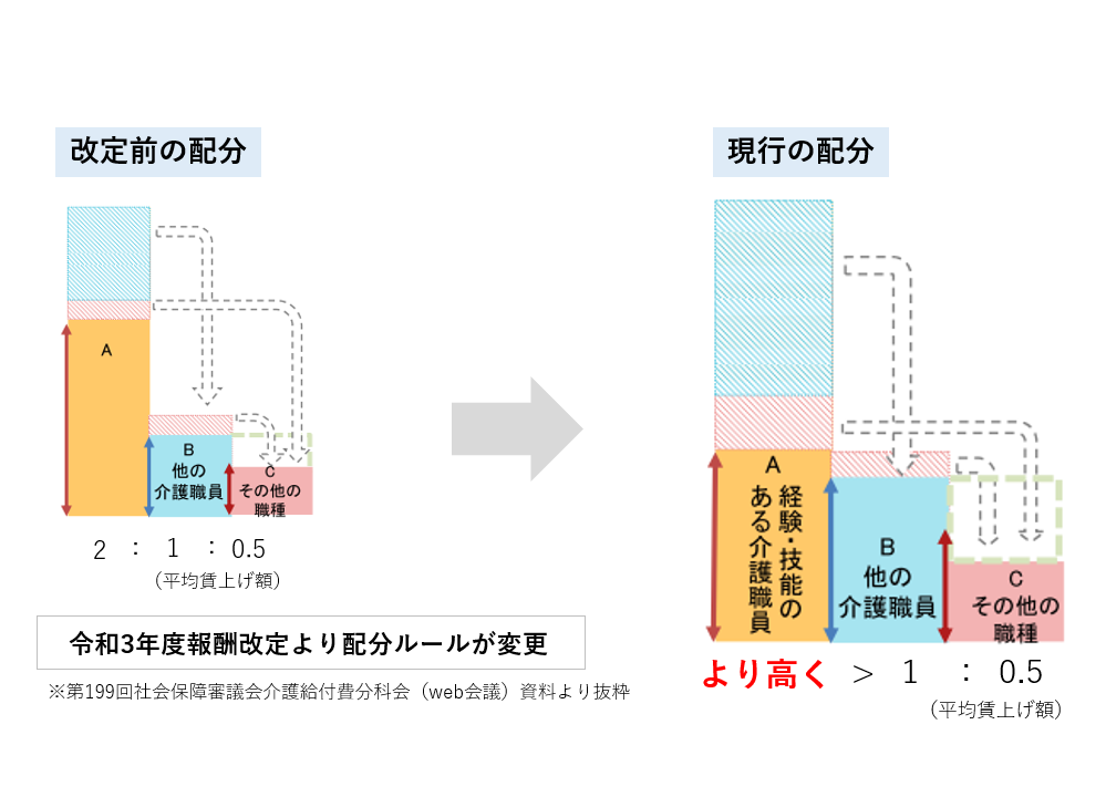 • 平均賃上げ額はB(その他の介護職員)はA(経験、技能のある介護職員)より小さくなくてはいけない